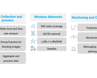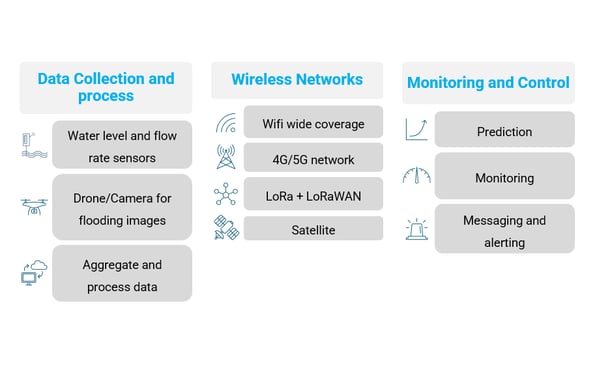 Water level and flow rate sensors, weather stations, cameras, and drones